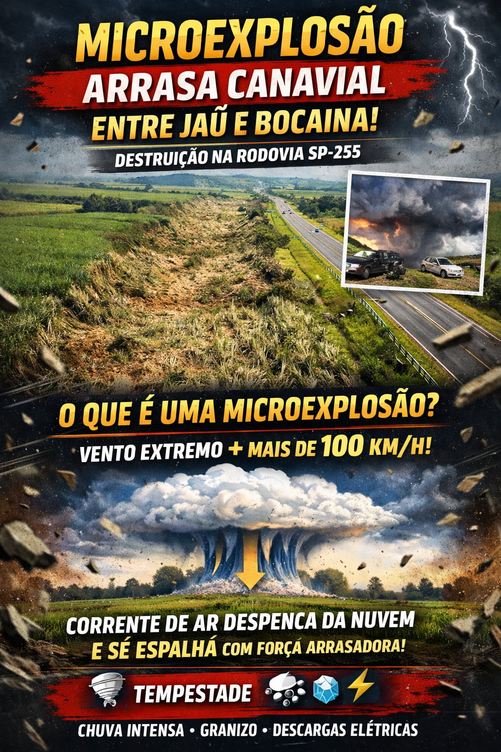 Um fenômeno meteorológico raro e violento deixou um rastro de destruição impressionante às margens da Rodovia Comandante João Ribeiro de Barros (SP-255), entre Jaú e Bocaina.