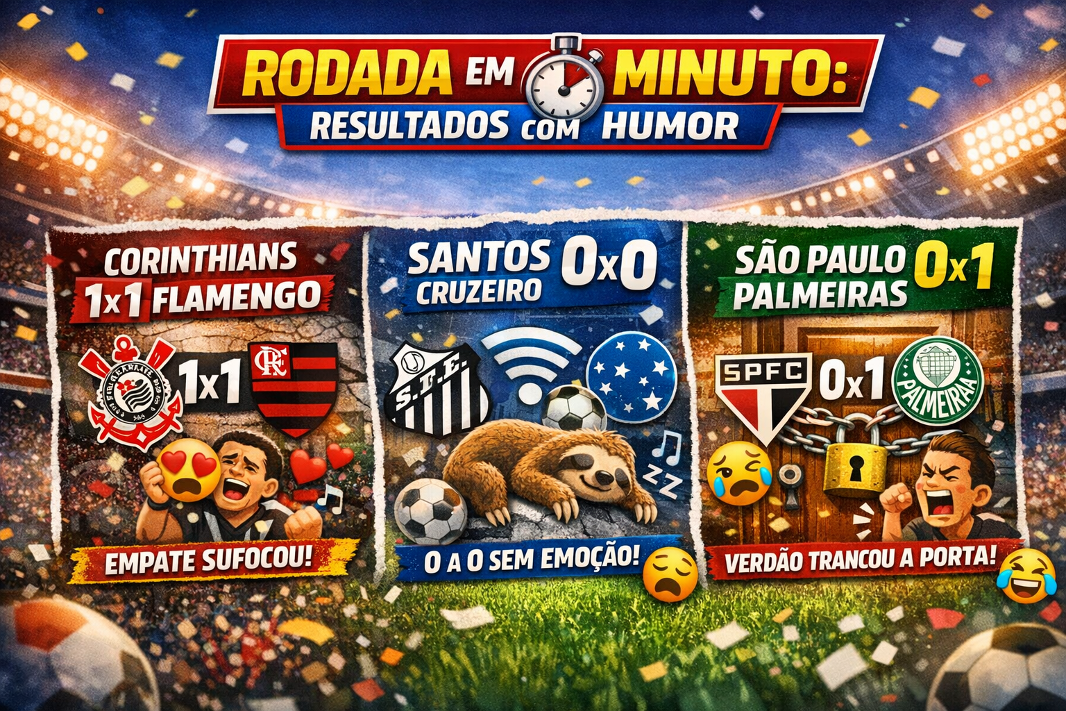 O Corinthians ficou no 1×1 com o Flamengo… aquele jogo com cara de “dava pra ganhar, dava pra perder, então vamos empatar mesmo e deixar todo mundo nervoso” 😅⚫⚪ Torcida saiu com o coração batendo no ritmo de bateria de escola de samba. O Santos fez um 0x0 com o Cruzeiro que… olha… foi mais travado que Wi-Fi ruim 🐟📶 Teve luta, teve correria, mas o gol resolveu tirar folga e nem apareceu em campo 😂 E no clássico, o São Paulo acabou tomando 0x1 do Palmeiras… Verdão foi lá, achou um golzinho e depois fechou a casinha com cadeado, corrente e senha 🔒🟢 Enquanto isso, o Tricolor ficou naquele “bate, bate e nada de entrar”, estilo insistente no portão fechado 😬
